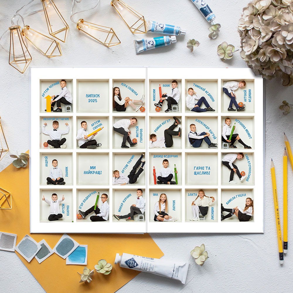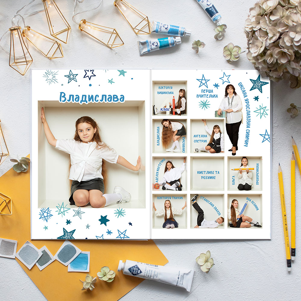 Величезний портрет вашої дитини на обкладинці і 1 фото на персональному розвороті.